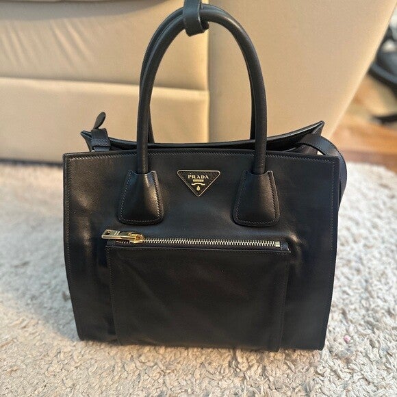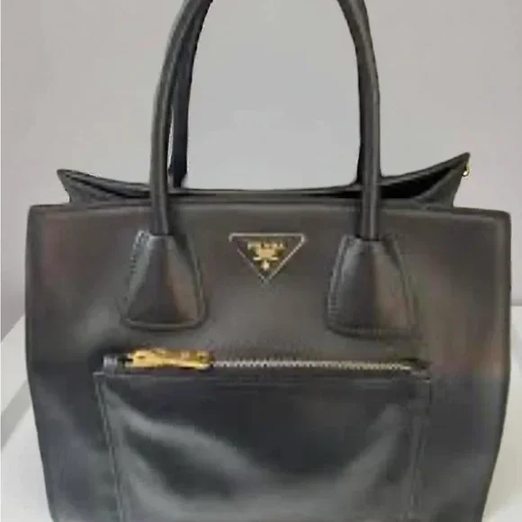 Sophisticated Prada tote in sleek black. Features premium leather and iconic design.