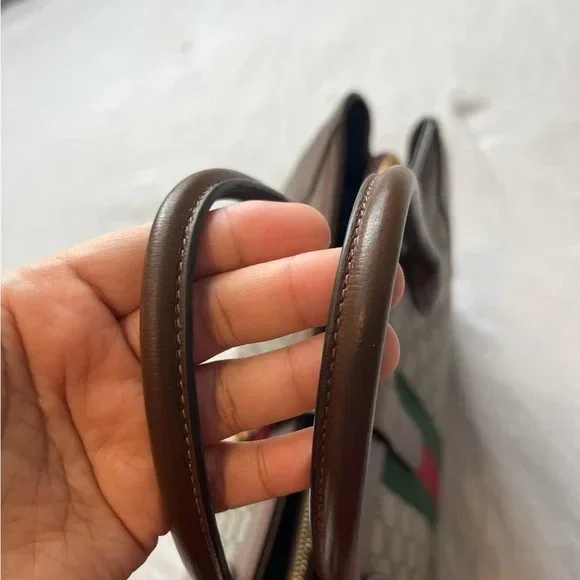 Features brown leather accents and green-red stripe detail.