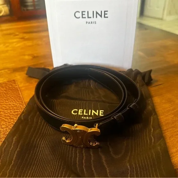 Celine TRIOMPHE BELT IN TAURILLON LEATHER Black Leather Belt with Gold Accent
