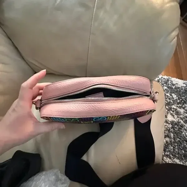 Make a bold statement with this authentic Gucci GG Supreme crossbody, featuring an eye-catching multicolor GG logo pattern set against a dark base. Accented with soft pink trim and a coordinating adjustable strap, this piece blends playful energy with Gucci’s iconic design language.