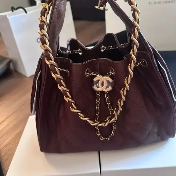 The bag features a leather-woven gold chain shoulder strap, allowing for comfortable shoulder wear while maintaining the timeless Chanel aesthetic. The design is enhanced with gold chain drawstring detailing, creating a chic bucket silhouette that is both modern and unmistakably Chanel.